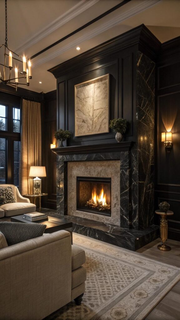 Consider surrounding the fireplace with dark stone or brick to create a dramatic effect. Adding comfortable seating nearby can create an inviting space for gatherings or quiet evenings.