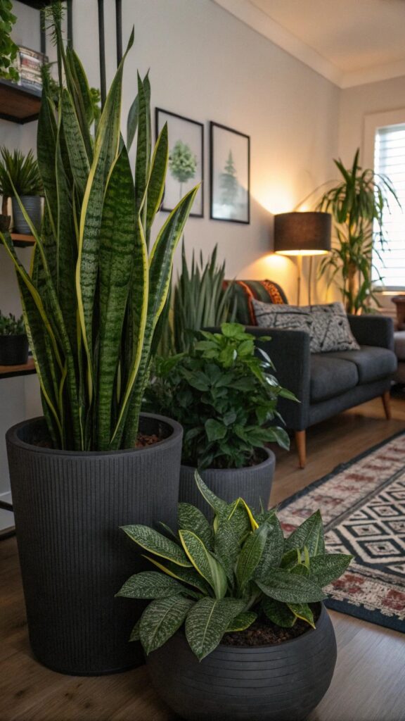 Choose plants with deep green foliage that thrive in lower light conditions, such as snake plants or pothos. Use dark pots or planters to maintain the moody aesthetic, and group plants together for a lush focal point.