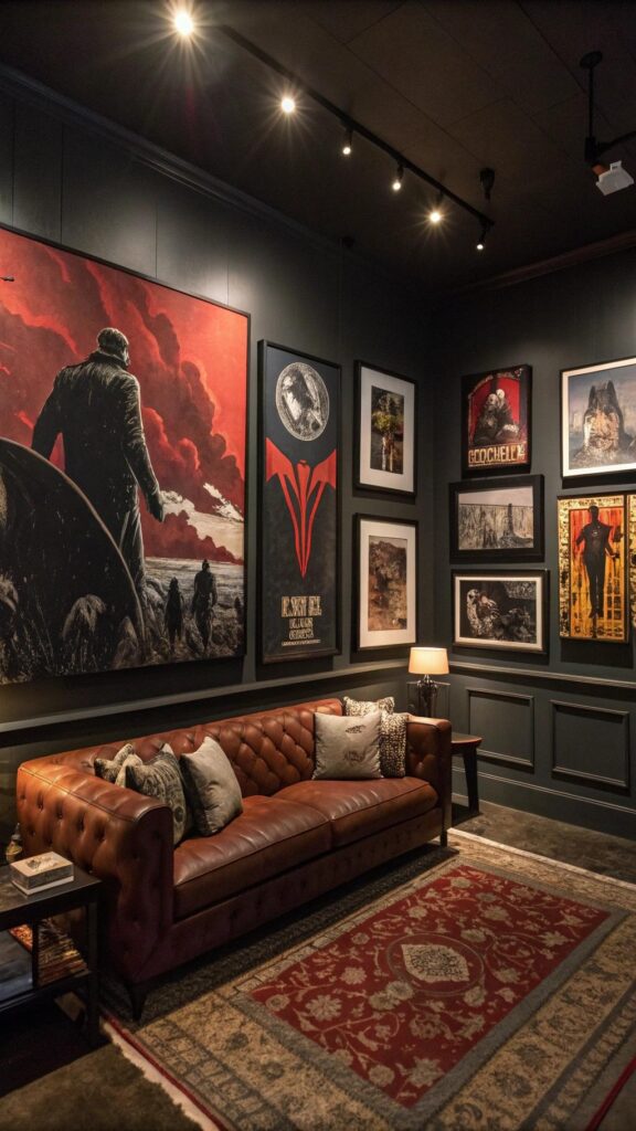 Consider using large-scale artwork to make a statement on your walls. Alternatively, a gallery wall with a mix of framed prints and paintings can add personality and depth to the space. The key is to select artwork that resonates with your style while complementing the overall dark and moody theme.
