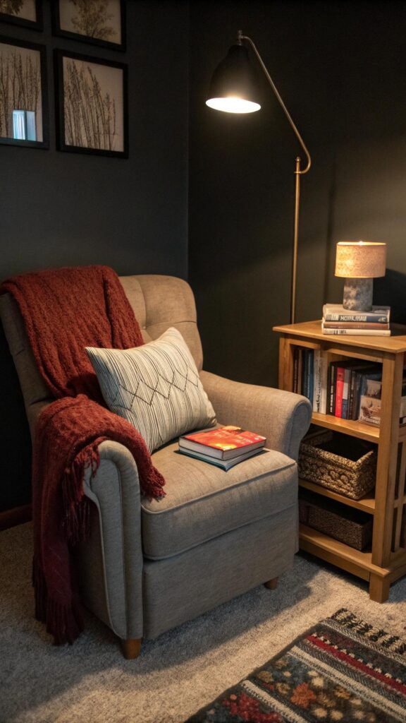 To enhance the coziness, layer the nook with soft throws and cushions in dark or rich colors. Adding a small bookshelf or a stack of your favorite books can also make the space feel inviting and personal.