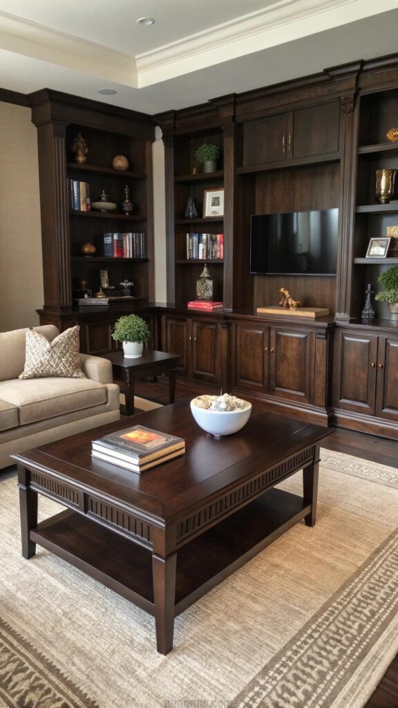 Consider incorporating a dark wood coffee table or side tables to anchor the space. Pair these pieces with lighter upholstery to create a balanced look. Additionally, using dark wood shelving can provide a stylish way to display books and decorative items.