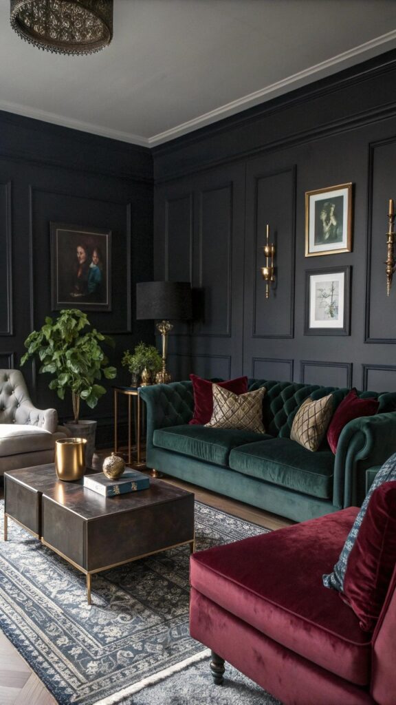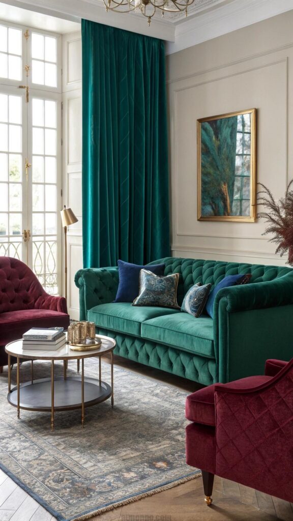 To create a cohesive look, consider using a mix of jewel tones throughout the room. For example, an emerald green sofa paired with sapphire blue throw pillows and a deep burgundy accent chair can create a stunning visual impact.