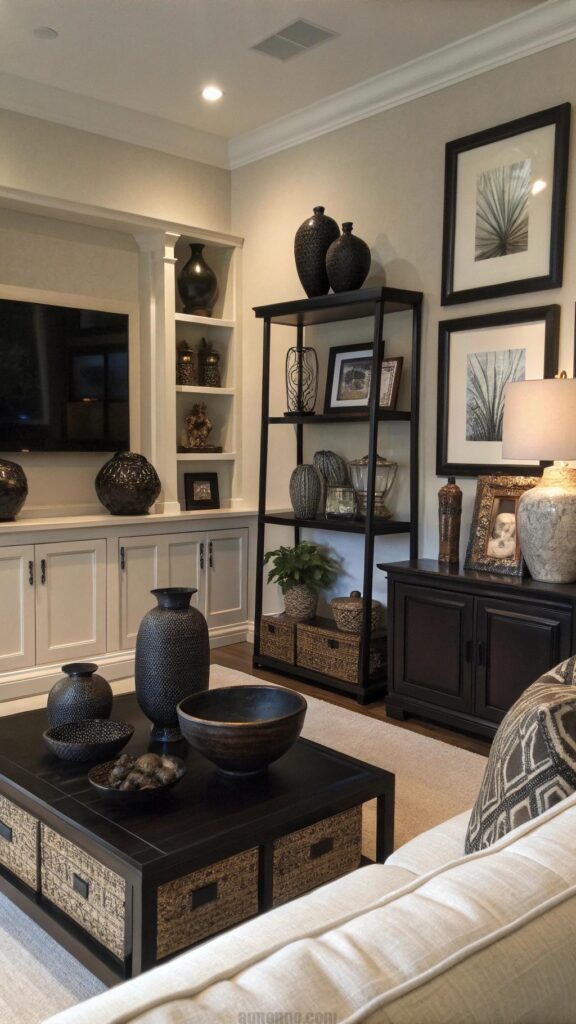 Incorporating dark accents throughout your living room can tie the space together. Consider using dark-colored accessories like vases, picture frames, or decorative bowls to add subtle touches of depth.