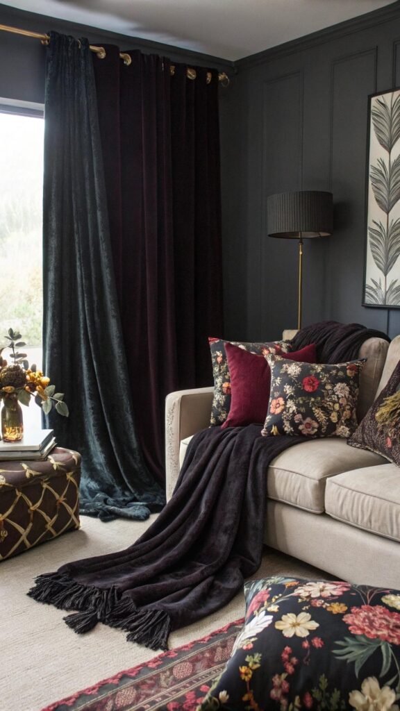 When selecting fabrics, think about layering different textures and patterns. For example, a dark floral print on cushions can add a touch of romance, while a solid dark throw can provide contrast and balance.