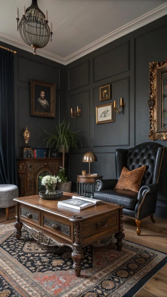 Incorporating vintage or antique pieces can add character and charm to your dark and moody living room. Look for unique items like an ornate coffee table, a vintage armchair, or decorative accessories that tell a story.