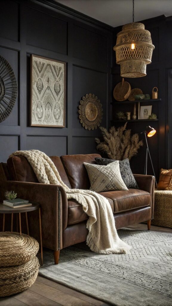 Layering different textures is key to achieving a dark and moody living room. Incorporate materials like velvet, leather, and wool to create depth and interest. A velvet sofa paired with a leather armchair and a wool throw can create a cozy yet sophisticated vibe.