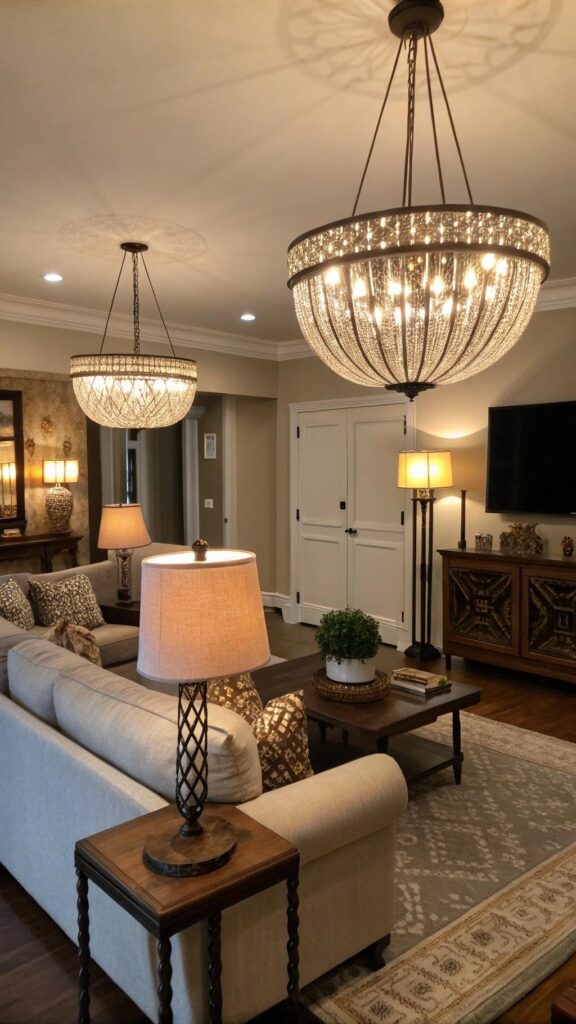 Warm-toned lighting is ideal for creating a cozy atmosphere. Use a combination of overhead fixtures, floor lamps, and table lamps with dimmable options to adjust the mood as needed. Statement lighting fixtures can also serve as focal points.