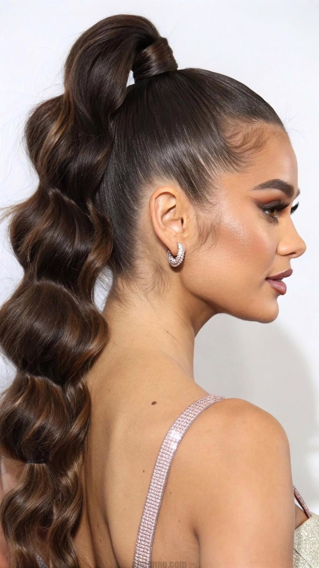 Thick hair holds volume well, making a high ponytail look fuller. Use a bristle brush to smooth flyaways for a neat appearance. This style works for both casual outings and formal events with minimal effort.