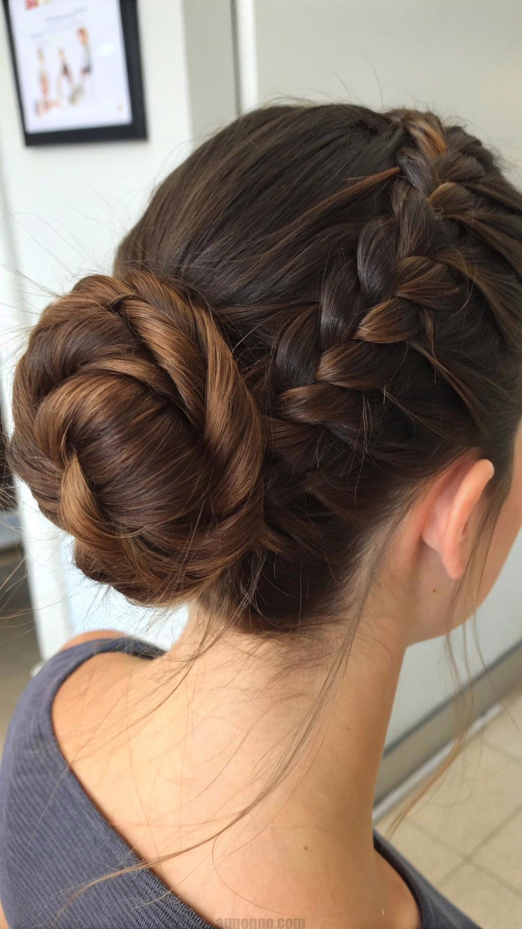 This style keeps thick hair completely controlled. Ideal for formal workplaces or weddings. The braided detail adds visual interest to the classic bun.