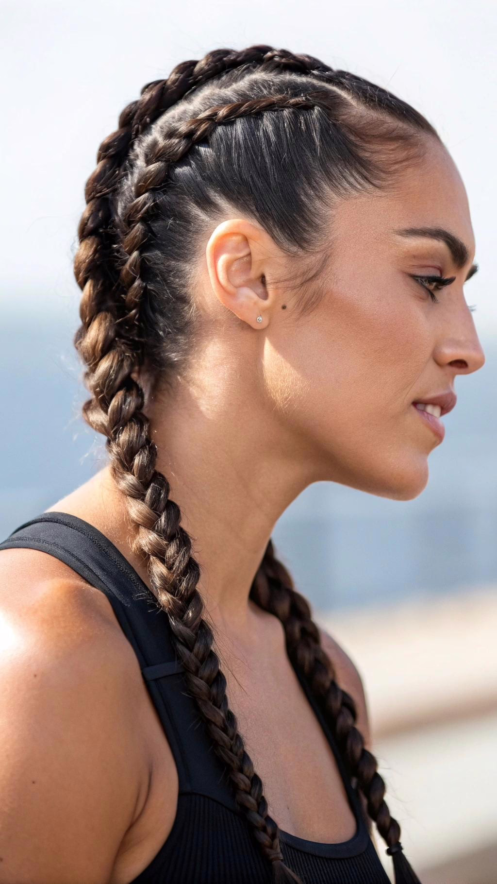 Double Dutch braids are perfect for keeping thick hair under control. Part your hair down the middle and create two Dutch braids along the scalp. Secure the ends with elastics for a sporty-chic look.