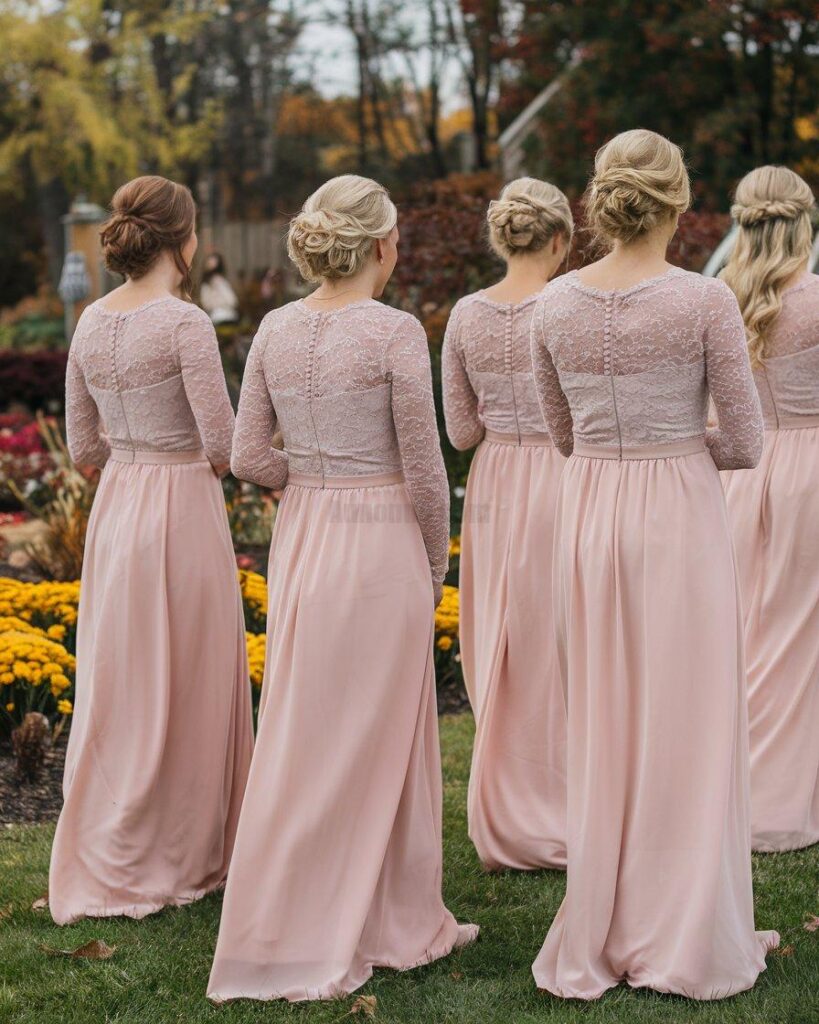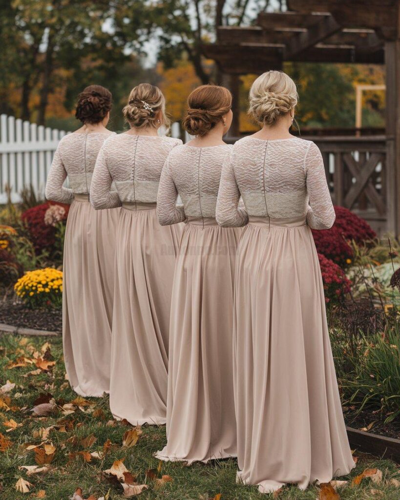 Blush pink is a soft, romantic color that works beautifully for fall weddings. Long-sleeve dresses add warmth and elegance to the look. This style is perfect for cooler fall temperatures.