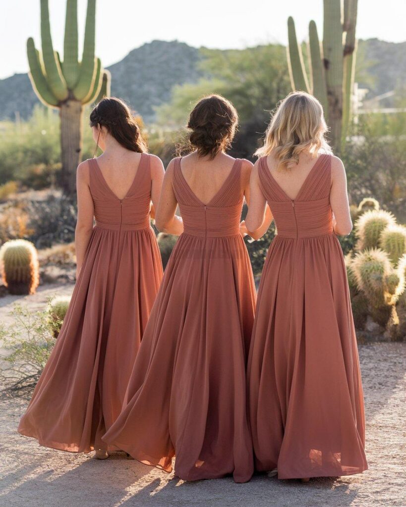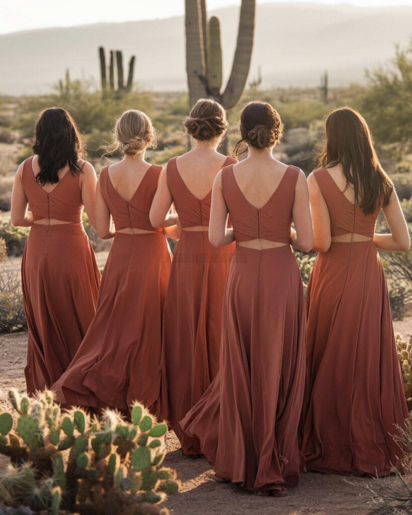 Terracotta is a warm, earthy color that’s perfect for fall weddings. Maxi dresses create a dramatic and elegant look. This style is ideal for both indoor and outdoor ceremonies.