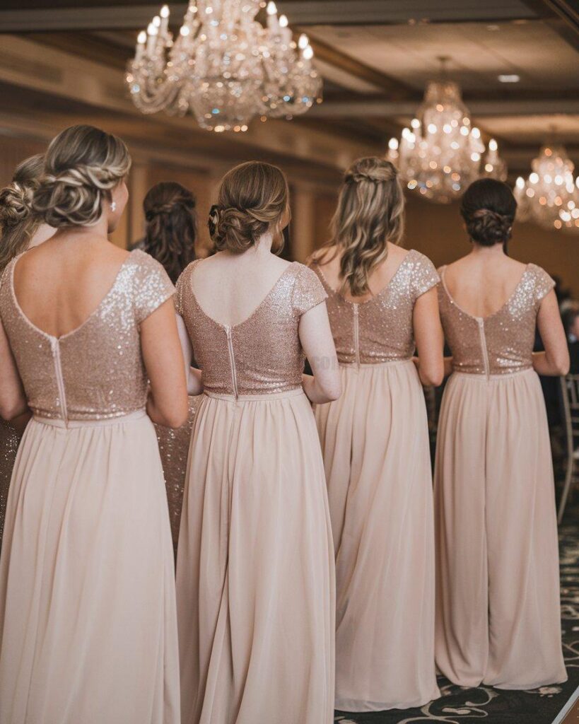Choose dresses with lace or sheer sleeves for added texture. Pair them with silver or rose gold accessories for a cohesive look. Your bridesmaids will look effortlessly beautiful in these gowns.