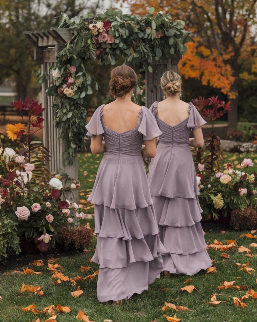 Lavender is a soft, romantic color that’s perfect for fall weddings. Chiffon dresses in this shade add movement and elegance to the look. This style is ideal for creating a dreamy, ethereal vibe.