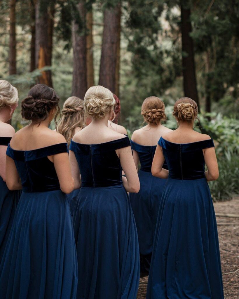 Navy blue is a classic, sophisticated color for fall weddings. Velvet dresses in this shade add a luxurious touch to the look. This style is both elegant and comfortable for your bridesmaids.