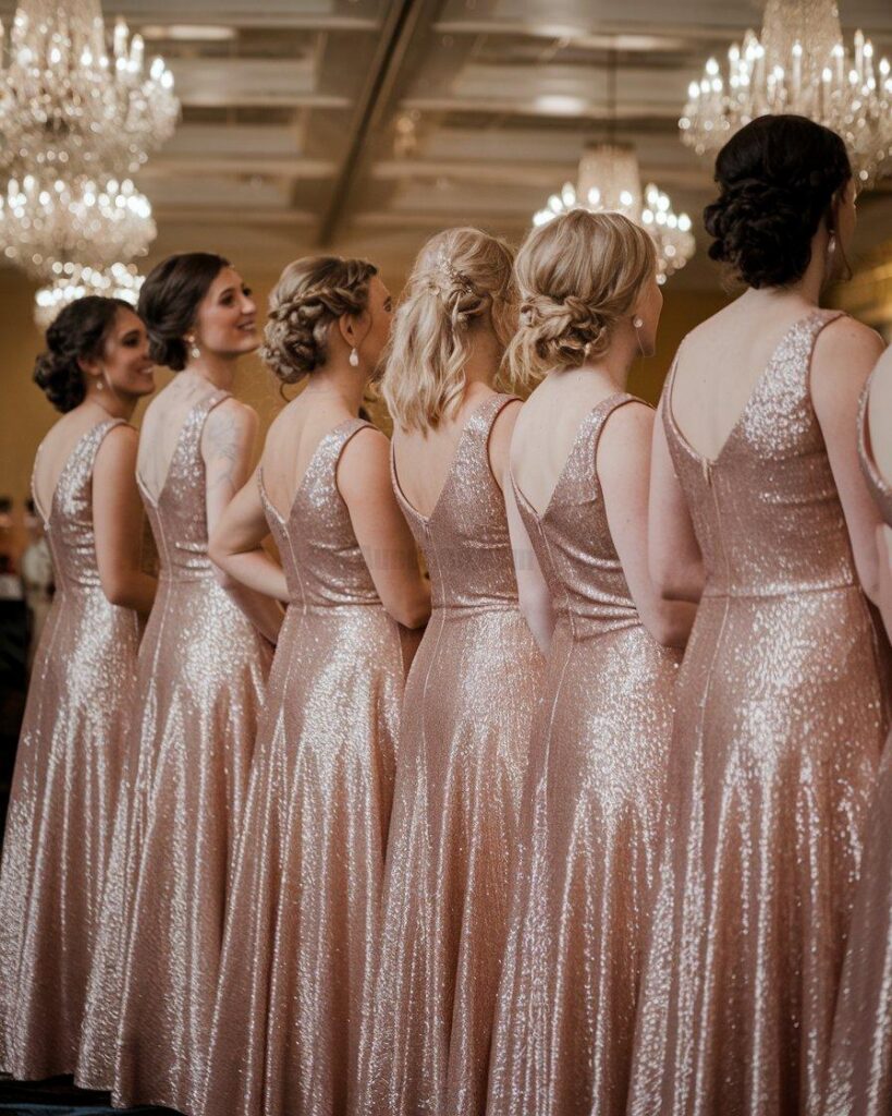 Sequins add a festive touch to the dresses, making them ideal for a fall celebration. Your bridesmaids will stand out in these stunning gowns. Pair them with simple jewelry to keep the focus on the dresses.