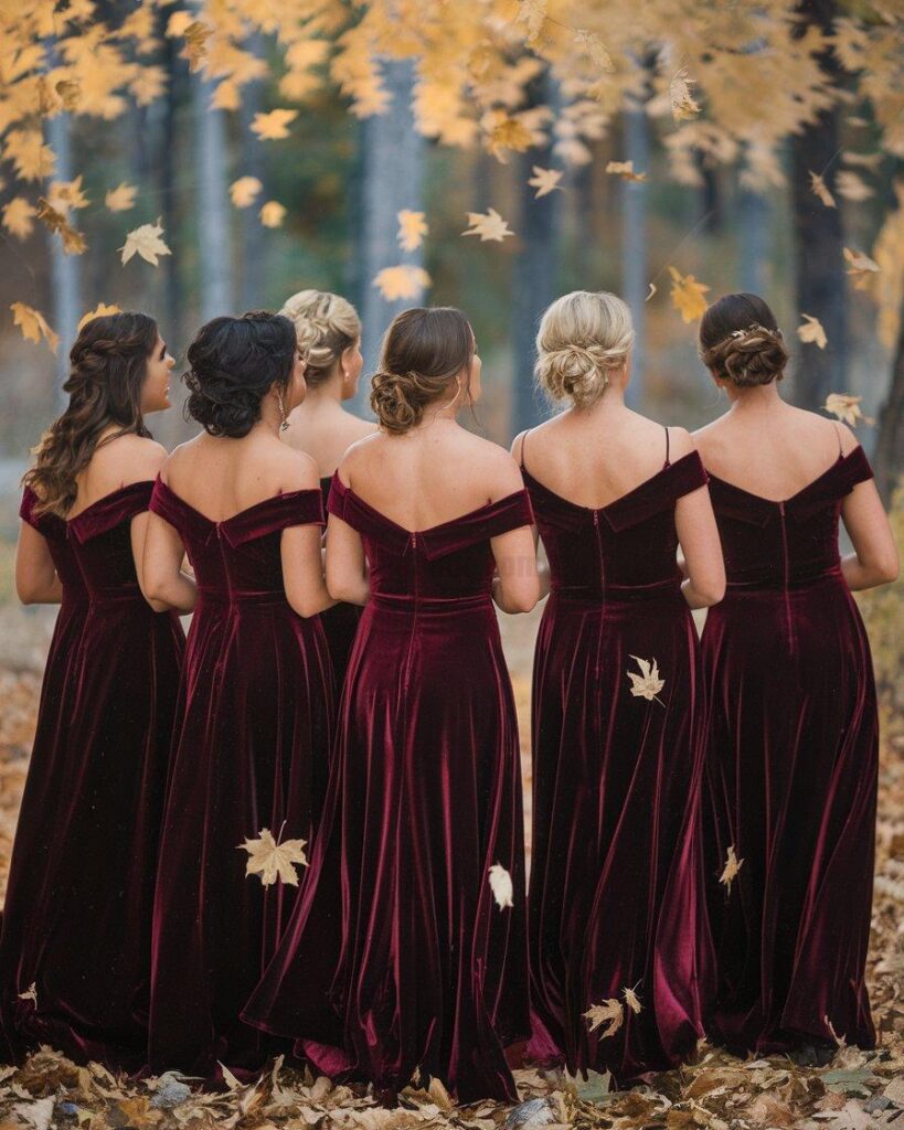 Deep burgundy velvet dresses are a timeless choice for fall weddings. The rich color complements the season’s palette, and the velvet fabric adds a luxurious touch. These dresses work well for both indoor and outdoor ceremonies.