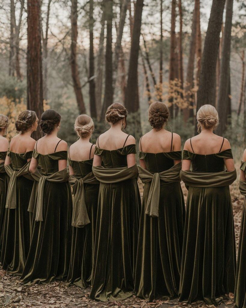 Hunter green is a deep, rich color that’s perfect for fall weddings. Velvet dresses add a luxurious touch to the look. This style is both elegant and comfortable for your bridesmaids.