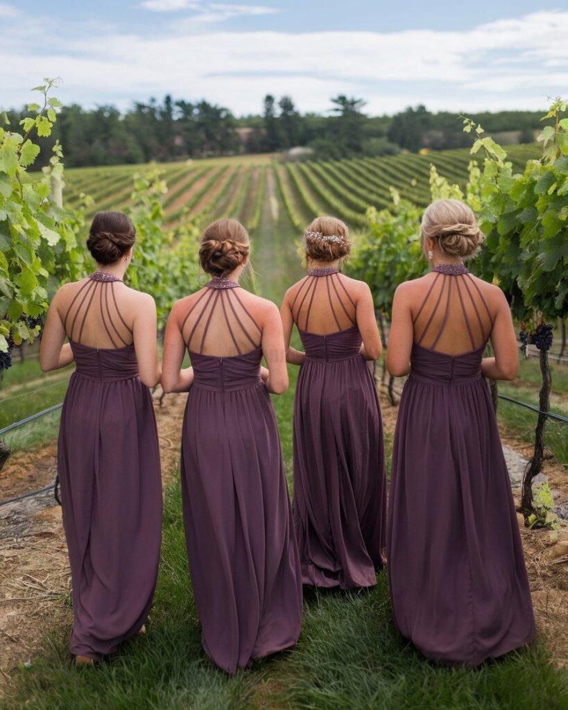 Pair the dresses with gold or bronze accessories for a warm, autumnal look. The deep plum color looks stunning against fall foliage. Your bridesmaids will feel confident and stylish in these dresses.