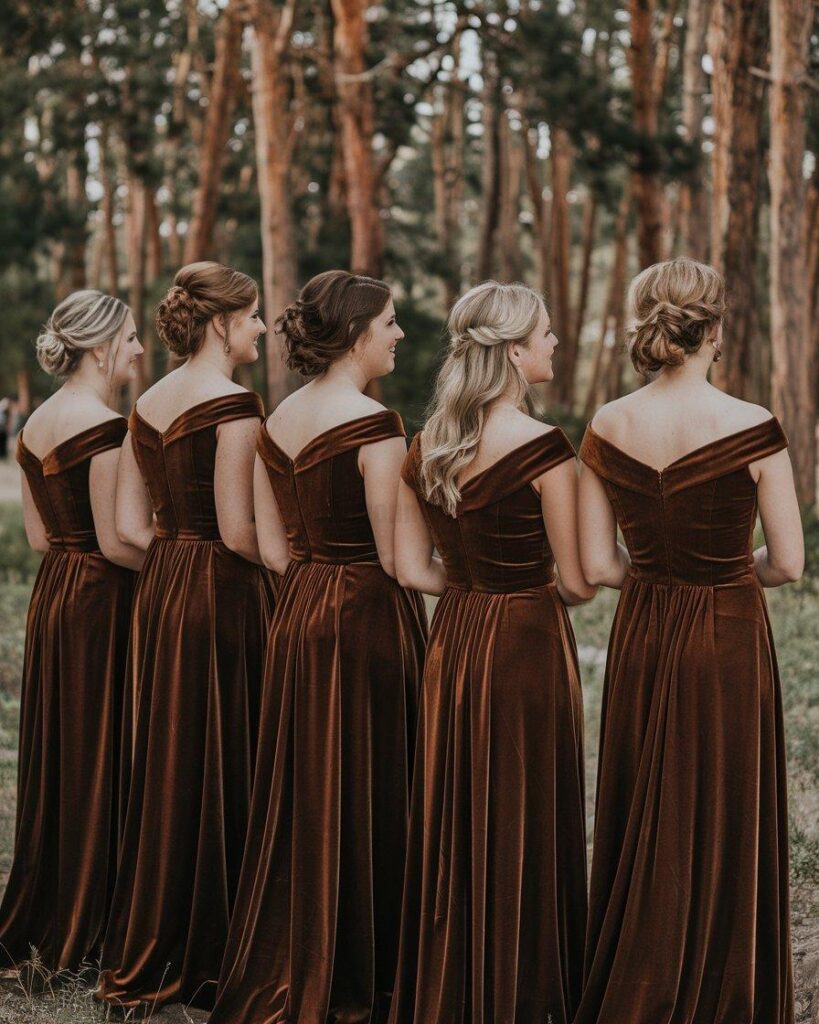 Chocolate brown is a warm, rich color that’s perfect for fall weddings. Velvet dresses in this shade add a luxurious touch to the look. This style is both elegant and comfortable for your bridesmaids.