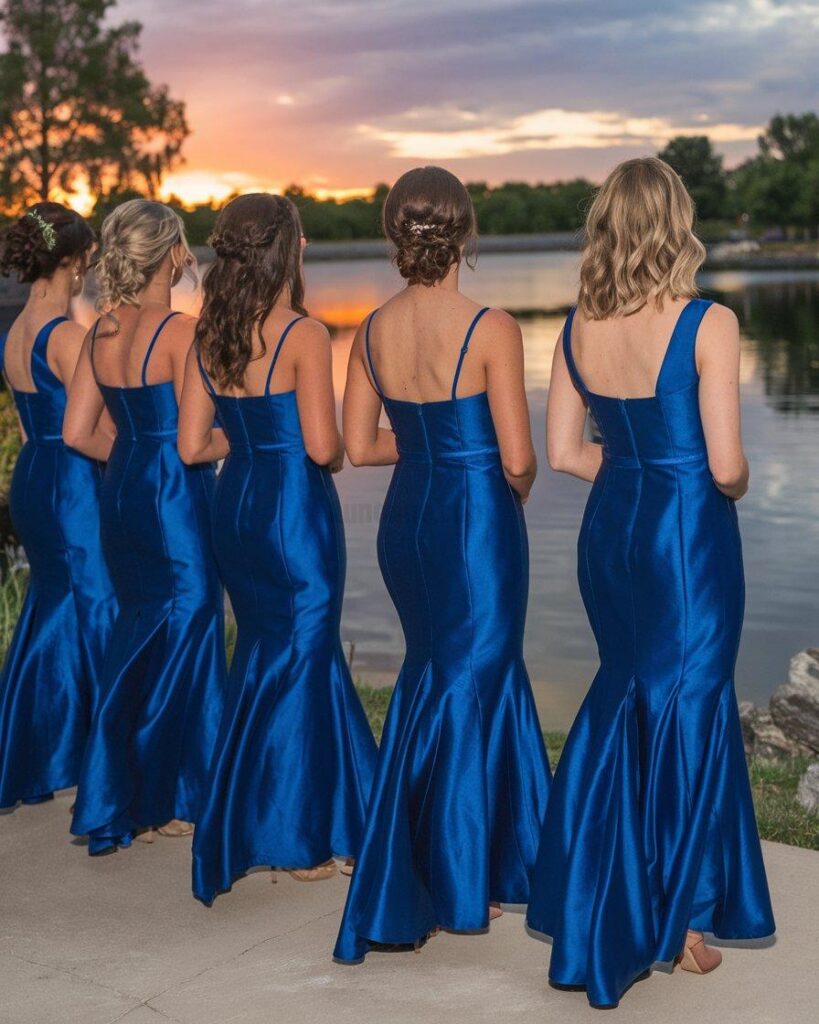 Pair the dresses with silver or pearl accessories for a cohesive look. The rich cobalt blue color stands out against fall foliage. Your bridesmaids will feel confident and stylish in these gowns.