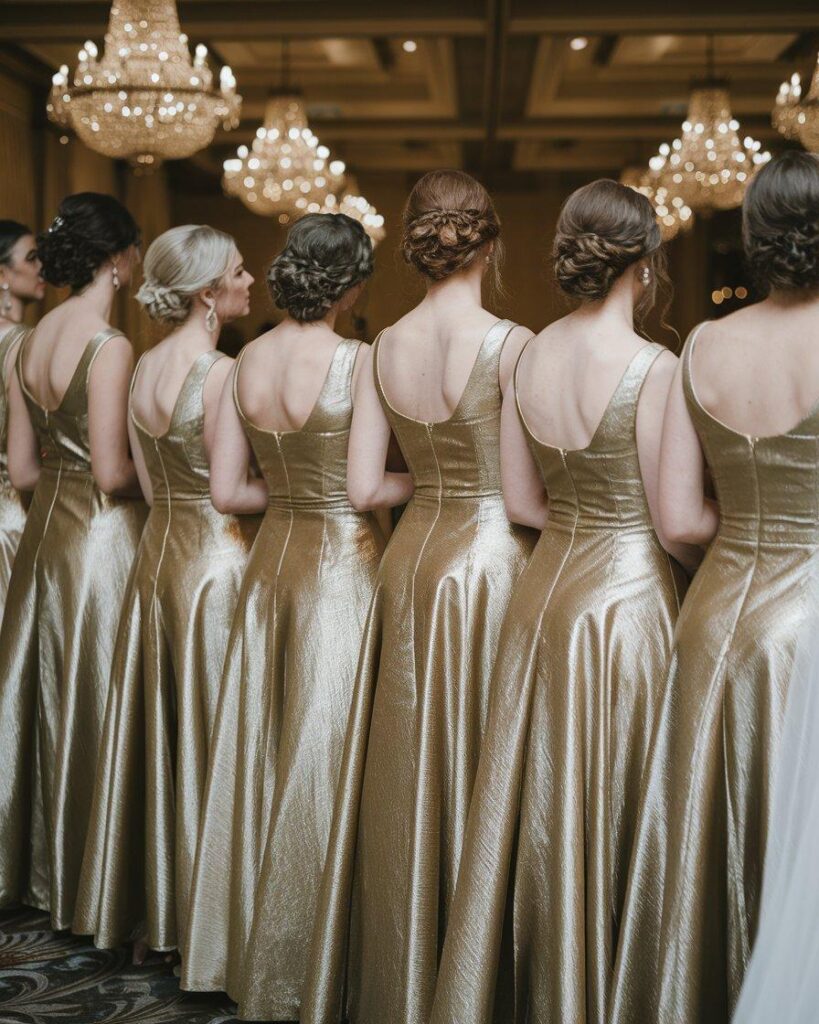 Metallic dresses add a festive touch to the look, making them ideal for a fall celebration. Your bridesmaids will stand out in these stunning gowns. Pair them with simple jewelry to keep the focus on the dresses.