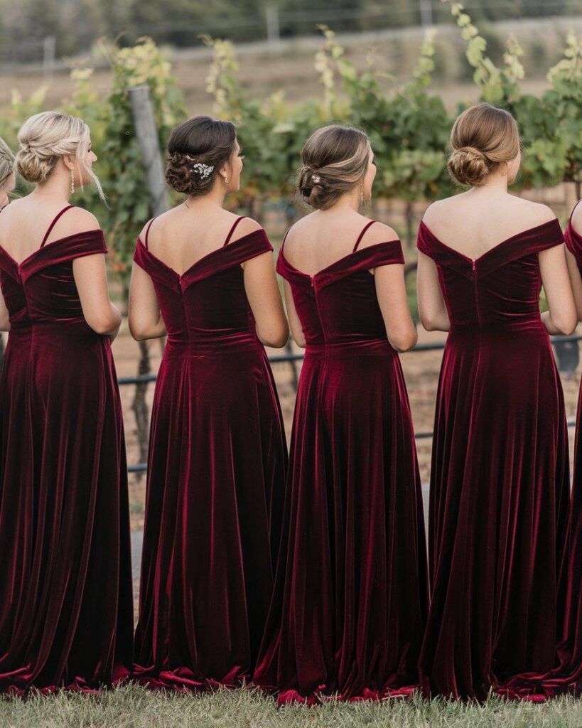 Pair the dresses with gold or silver accessories for a polished finish. The deep burgundy color looks stunning against fall foliage. Your bridesmaids will feel like princesses in these gowns.
