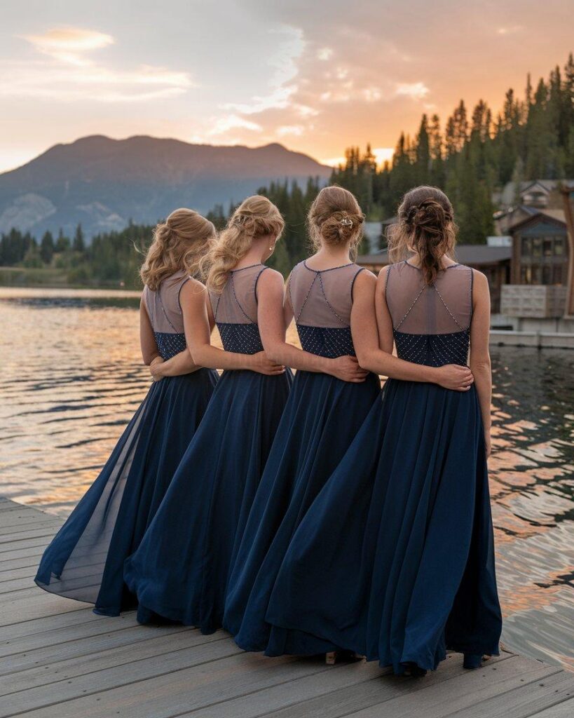 Pair the dresses with silver or pearl accessories for a polished finish. The navy blue color looks stunning against fall foliage. Your bridesmaids will feel confident and stylish in these gowns.