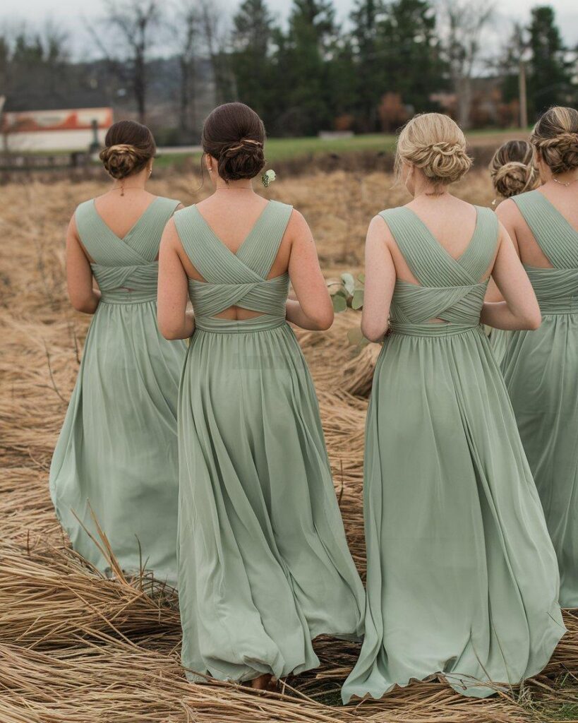 Pair the dresses with gold or wooden accessories for a natural vibe. The muted sage green color complements the autumn scenery. Your bridesmaids will look effortlessly chic in these dresses.