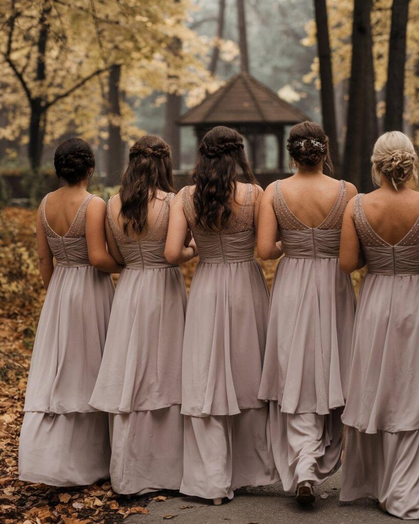 Pair the dresses with gold or rose gold accessories for a warm, autumnal vibe. The soft taupe color complements the autumn scenery. Your bridesmaids will look timeless in these gowns.