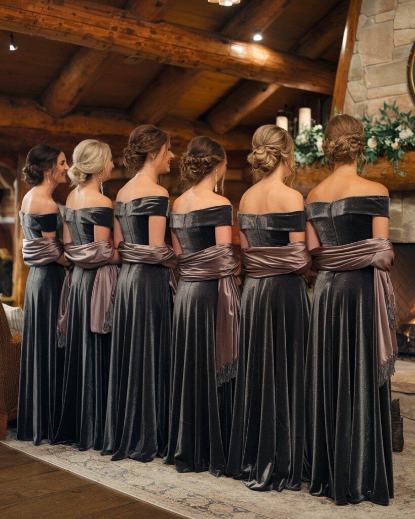 Charcoal gray is a sophisticated, modern color for fall weddings. Velvet dresses in this shade add a luxurious touch to the look. This style is both elegant and comfortable for your bridesmaids.