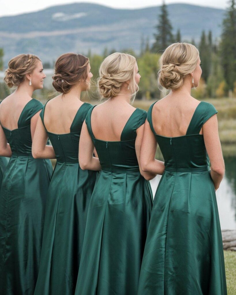 Pair the dresses with gold or silver accessories for a polished finish. The hunter green color looks stunning against fall foliage. Your bridesmaids will feel confident and stylish in these gowns.