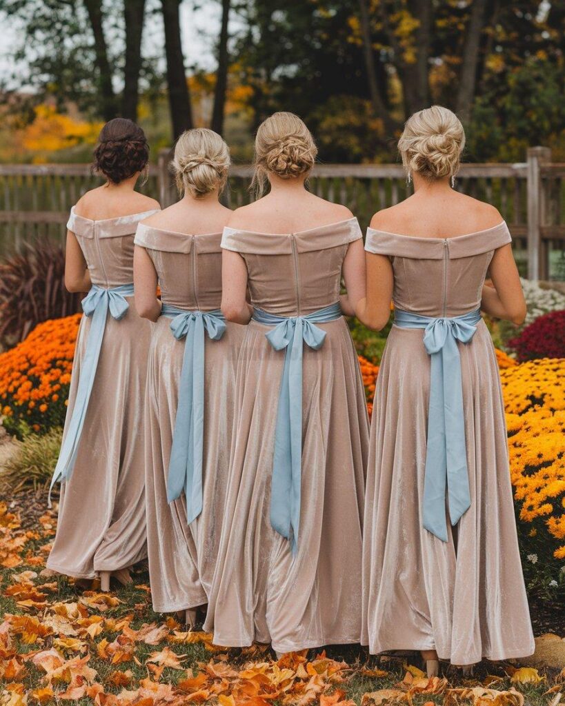 Pair the dresses with gold or rose gold accessories for a warm, elegant vibe. Velvet is also a great fabric for cooler fall temperatures. Your bridesmaids will feel comfortable and stylish throughout the day.
