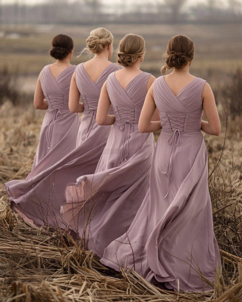 Pair the dresses with silver or rose gold accessories for a cohesive look. The warm tone of mauve complements the autumn scenery. Your bridesmaids will look effortlessly chic in these dresses.