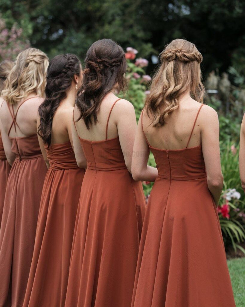 Pair the dresses with gold or wooden accessories for a natural vibe. The rich terracotta color complements the autumn scenery. Your bridesmaids will look stunning in these gowns.