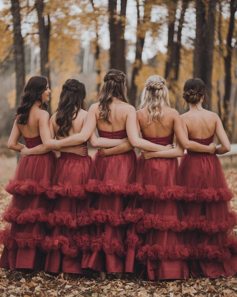 Cranberry is a vibrant, festive color that’s perfect for fall weddings. Tulle dresses add a touch of whimsy and romance to the look. This style is ideal for creating a dreamy, ethereal vibe.
