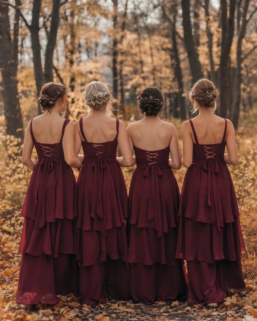 Pair the dresses with gold or silver accessories for a polished finish. The cranberry color looks stunning against fall foliage. Your bridesmaids will feel like princesses in these gowns.