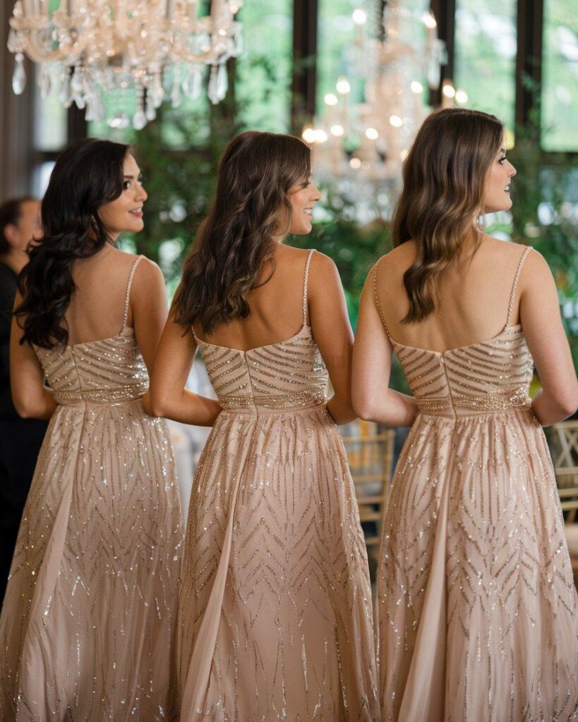 Choose dresses with layered skirts or subtle embellishments for added interest. Pair them with silver or pearl accessories for a polished finish. Your bridesmaids will look timeless in these gowns.