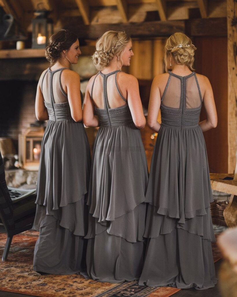 Pair the dresses with silver or pearl accessories for a polished finish. The charcoal gray color looks stunning against fall scenery. Your bridesmaids will look timeless in these gowns.