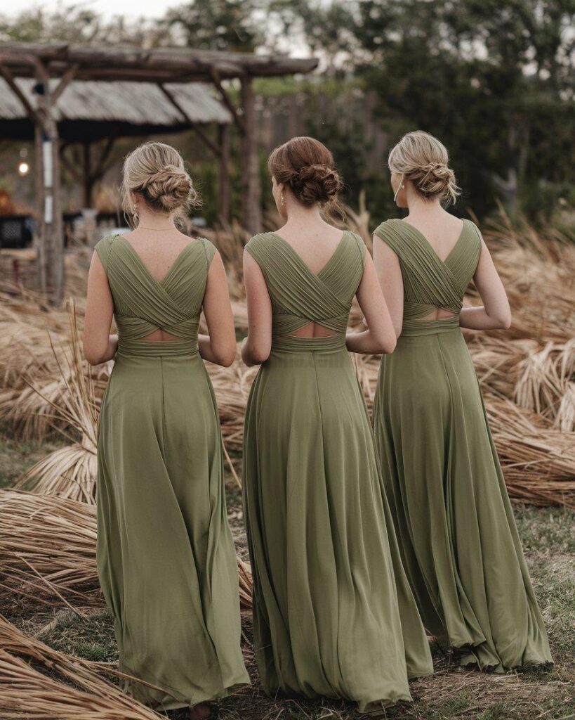 Pair the dresses with gold or wooden accessories for a natural vibe. The muted olive green color complements the autumn scenery. Your bridesmaids will look effortlessly chic in these dresses.