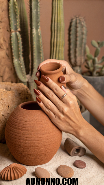 Terracotta nails bring earthy warmth inspired by clay pottery and desert landscapes. This orange-brown shade feels grounded and natural for autumn. The color coordinates with fall’s earth-tone fashion trends effortlessly.