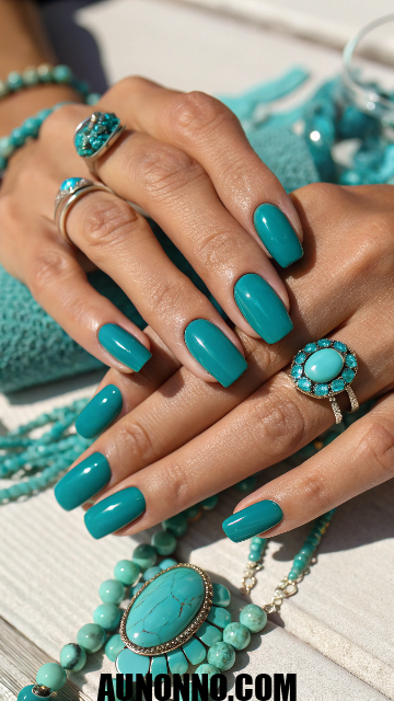 Teal blue nails offer unexpected color for autumn. This blue-green shade feels fresh and unique. The color stands out from traditional fall nail choices.