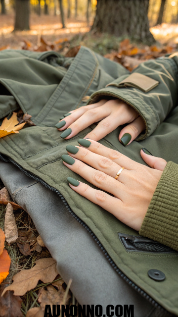 Olive green nails bring military-inspired style to your autumn look. This muted green shade feels earthy and grounded. The color coordinates with fall’s utilitarian fashion trends including cargo pants and field jackets.
