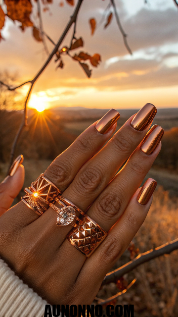 Copper metallic nails capture autumn sunlight on your fingertips. This warm metallic shade reflects the season’s golden hour lighting. The color adds instant glamour to casual and formal outfits alike.