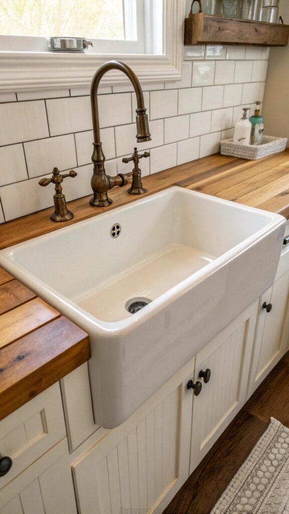 A farmhouse sink, or apron sink, is a functional and stylish addition to any bathroom. Its deep basin is perfect for washing up, and it can be paired with vintage-style faucets for a cohesive look. Choose a sink in white or a soft color to maintain a light and airy feel in the space.
