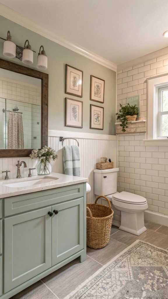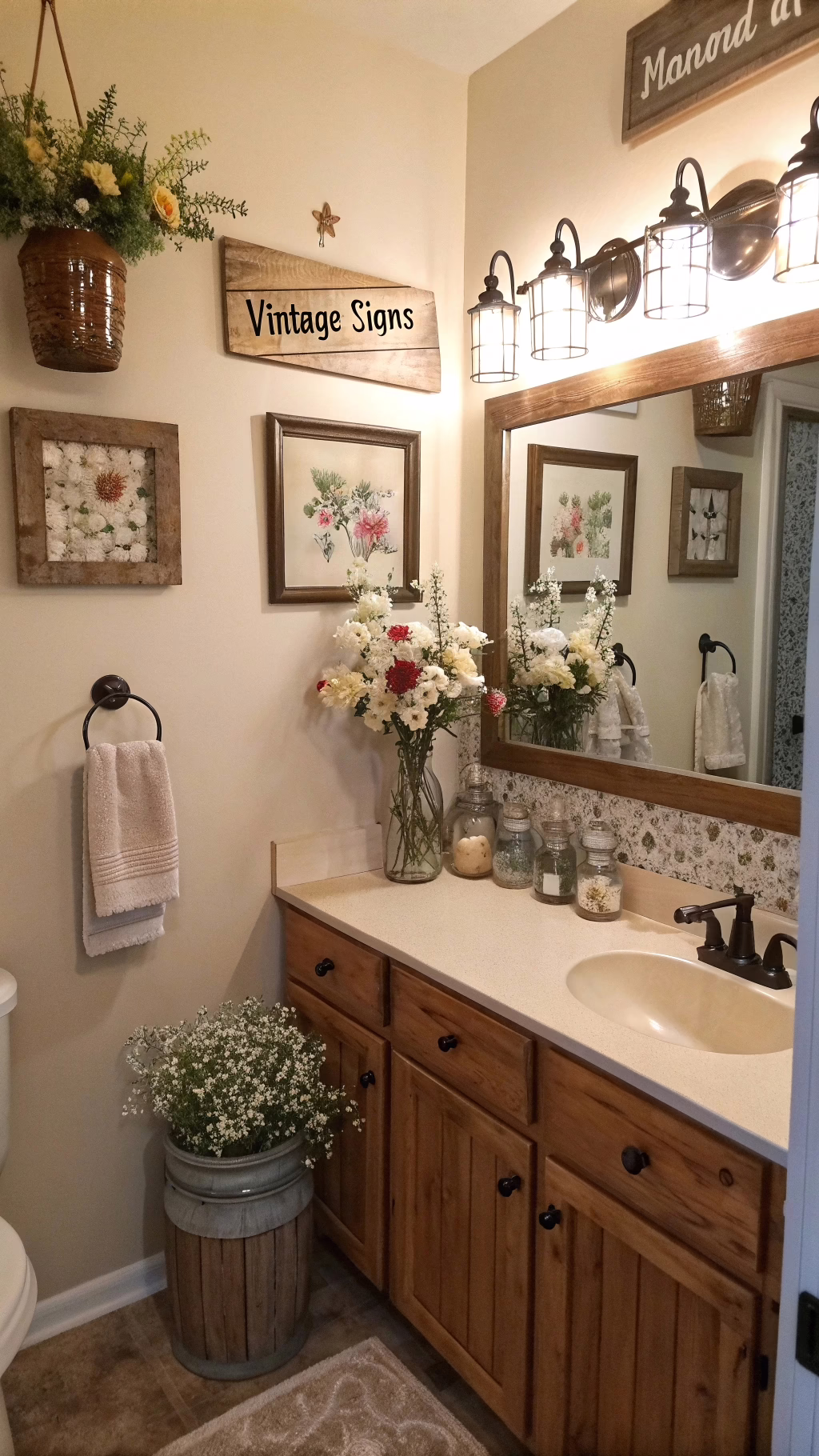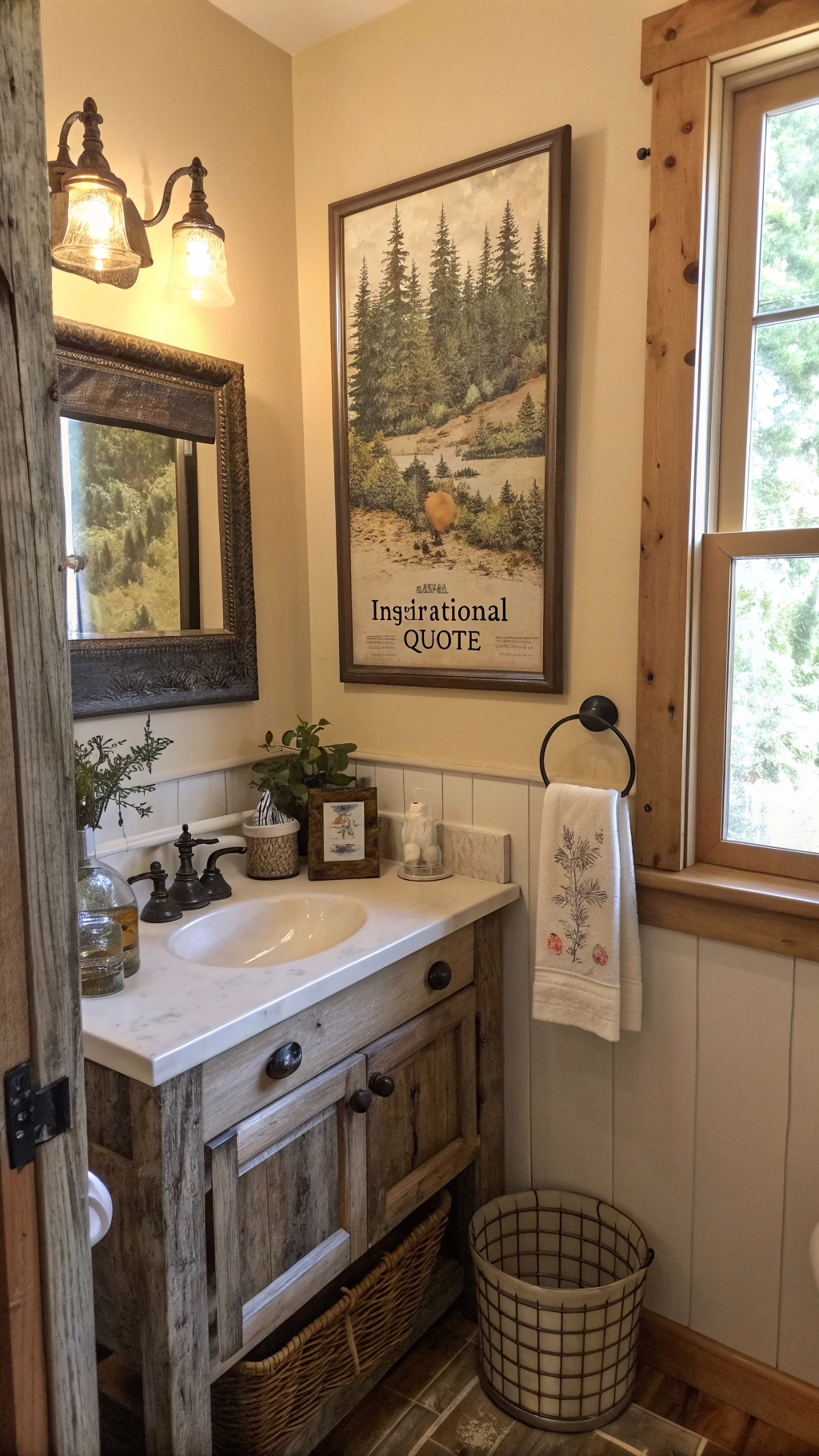 Adding rustic wall art can enhance the farmhouse feel of your bathroom. Look for pieces that feature nature themes, vintage prints, or inspirational quotes. These artworks can serve as focal points and add character to the walls, making the space feel more personalized.