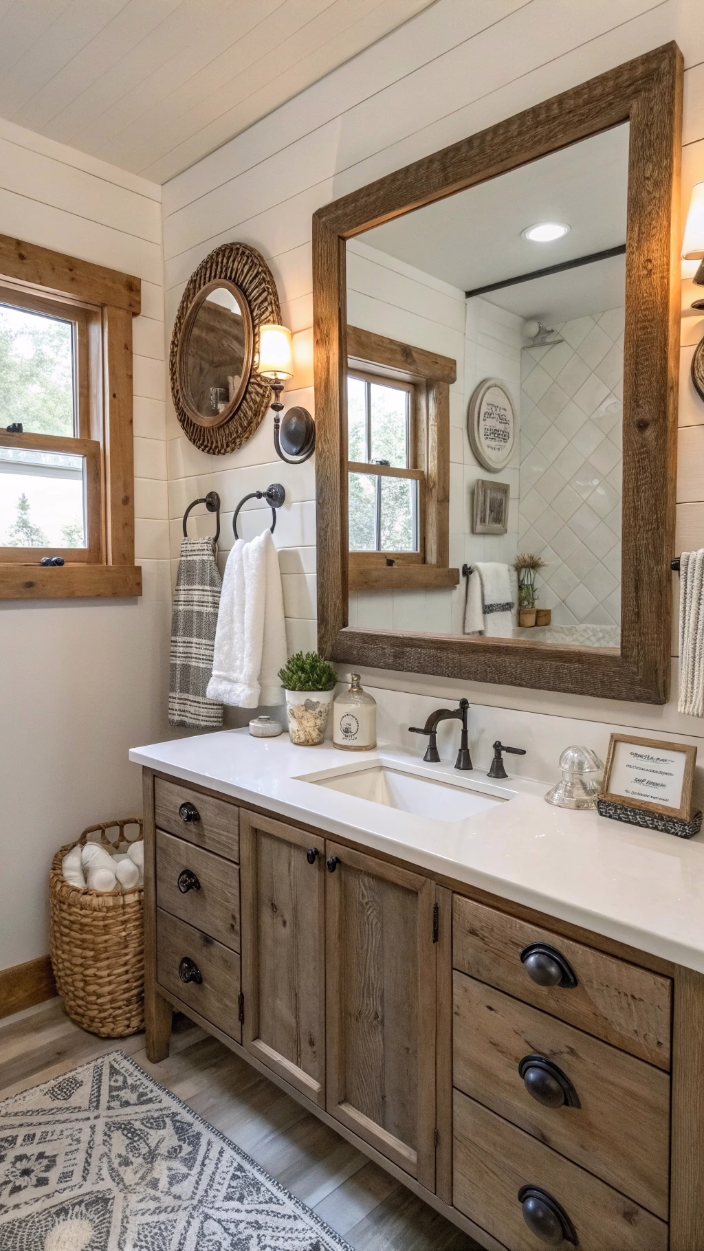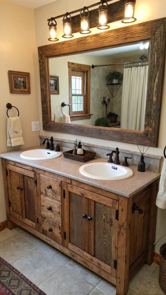 A rustic vanity made from reclaimed wood can add a unique touch to your farmhouse bathroom. Opt for a double sink design to accommodate family needs, and choose vintage-style faucets to enhance the rustic charm.