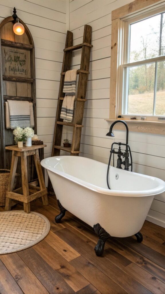 A vintage clawfoot tub is a quintessential element of farmhouse bathrooms. Its elegant curves and classic design create a focal point that draws the eye. Pair it with a rustic wooden stool and a vintage ladder for towels to enhance the farmhouse aesthetic. Consider adding a freestanding faucet in a matte black or brushed nickel finish to complete the look.
