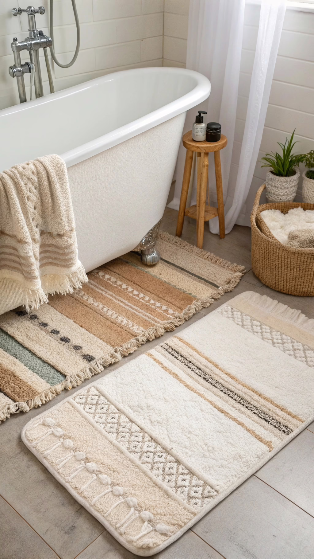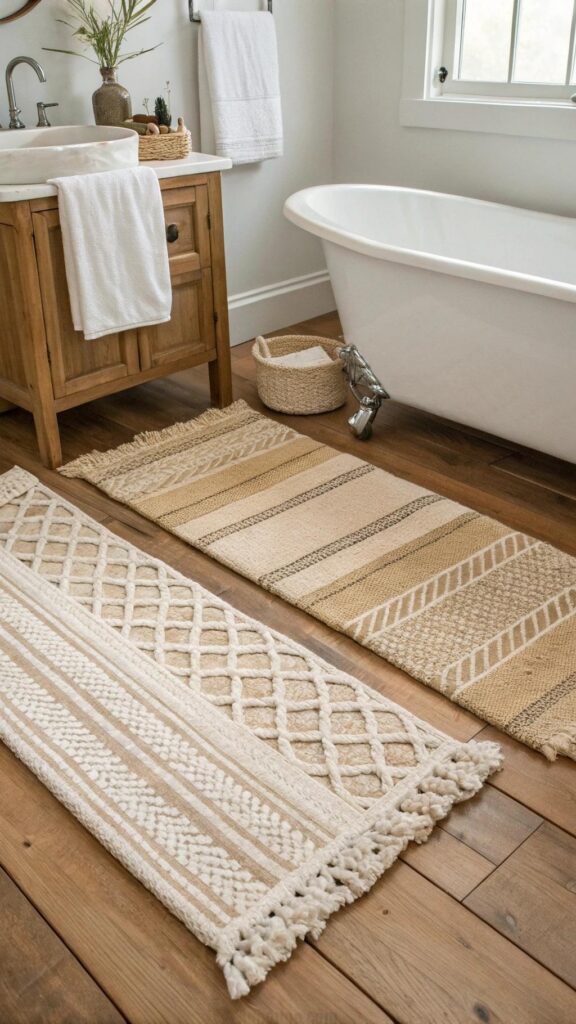 Adding textured rugs can enhance the comfort of your farmhouse bathroom. Opt for natural fibers like jute or cotton to maintain the rustic vibe. Layering rugs can also add depth and interest, while providing a soft surface underfoot. Choose neutral tones or subtle patterns to complement the overall design.