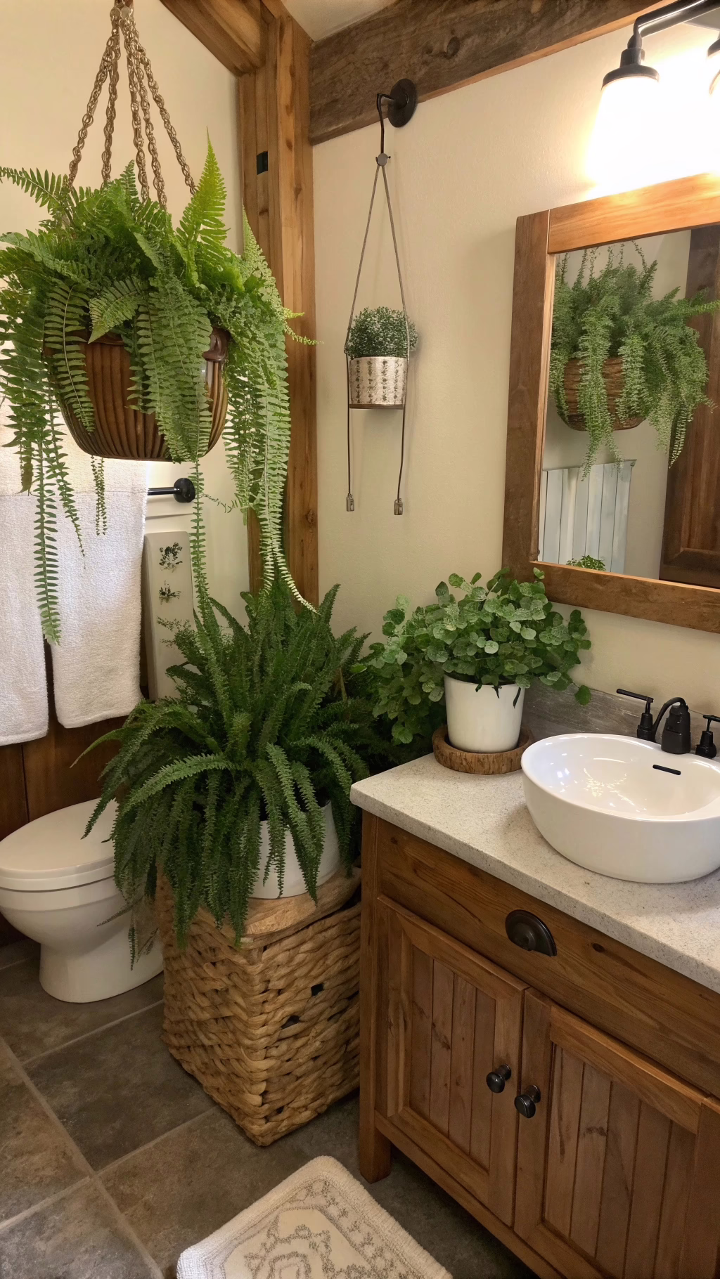 Adding plants to your farmhouse bathroom can enhance the natural feel of the space. Choose low-maintenance plants like succulents or ferns that thrive in humid environments. Use decorative pots or hanging planters to display them, bringing a touch of greenery and freshness to your bathroom.